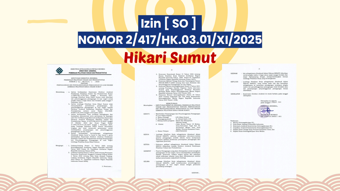 LPK Hikari Sumut merupakan LPK yang sudah memiliki izin MoU dan SO sebagai lembaga pelatihan dan penyaluran kerja ke Jepang. Hikari Sumut sebagai wadah dan solusi kepada teman-teman yang ingin meniti karir dan pengalaman kerja di Jepang tanpa perlu khawatir terkendala finansial.